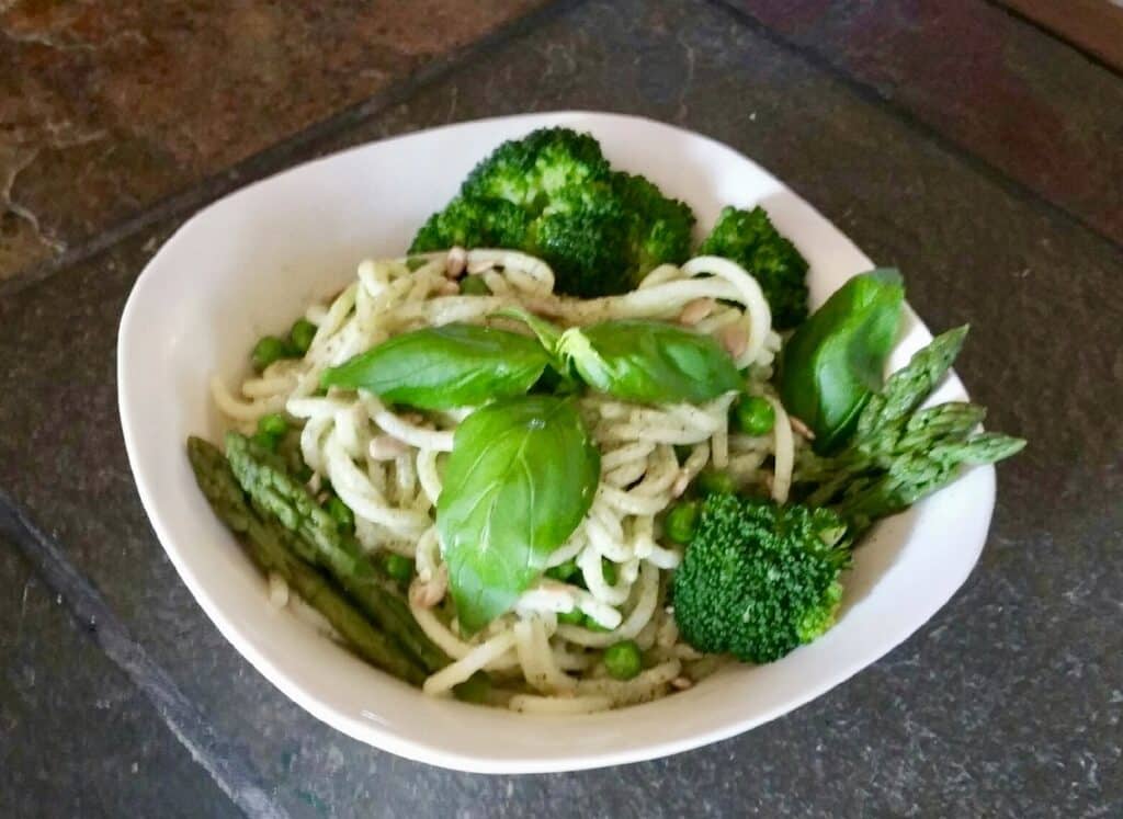 - Cook pasta per instructions, adding peas to the cooking water in the last two minutes. Meanwhile, steam the asparagus and broccoli for 3-4 minutes. Drain the pasta, stir in the pesto and almonds and season with freshly ground pepper. Serve with asparagus and broccoli topped with toasted sesame seeds.
