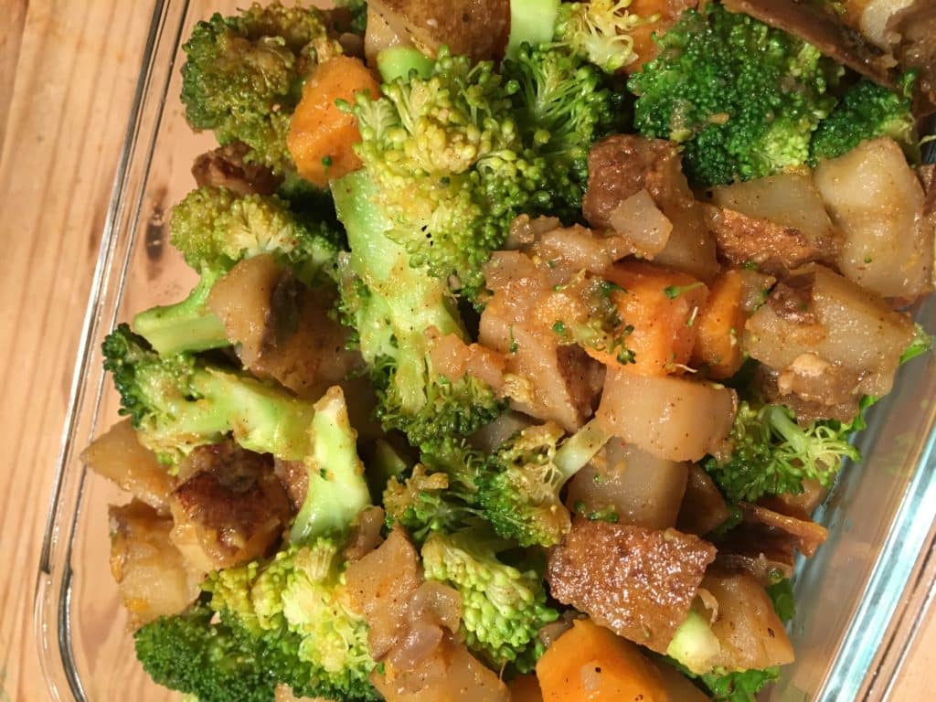 Bake or microwave the potatoes ahead of time – 30-40 minutes in 375-degree oven (whole). They should be soft on the outside – but it is alright if they are still firm in the center. Chop the shallot. Dice the potatoes into ½” chunks. Leave the skins on…. Trust me, you need the fiber. Using a bit of vegetable broth to keep the food from sticking to the pan, sauté the shallot and garlic over medium heat for a couple of minutes. Add the potatoes and distribute evenly. Let them cook for 10-15 minutes, adding a little broth as needed to keep the pan moist, and stir or toss frequently. Add the chili powder and a few sprinkles of salt and pepper while cooking. While the potatoes cook, rinse the broccoli and chop into bite sized pieces. Once the potatoes are warmed and softened add the broccoli on top, add about ¼ cup broth (just enough to cover the bottom of the pan), cover and simmer on low for about 5 minutes. Cut the lime into quarters. Add the greens to large bowls and top with the potato mixture. Add hot sauce if desired, or squeeze a lime over the finished dish. Serves 4.